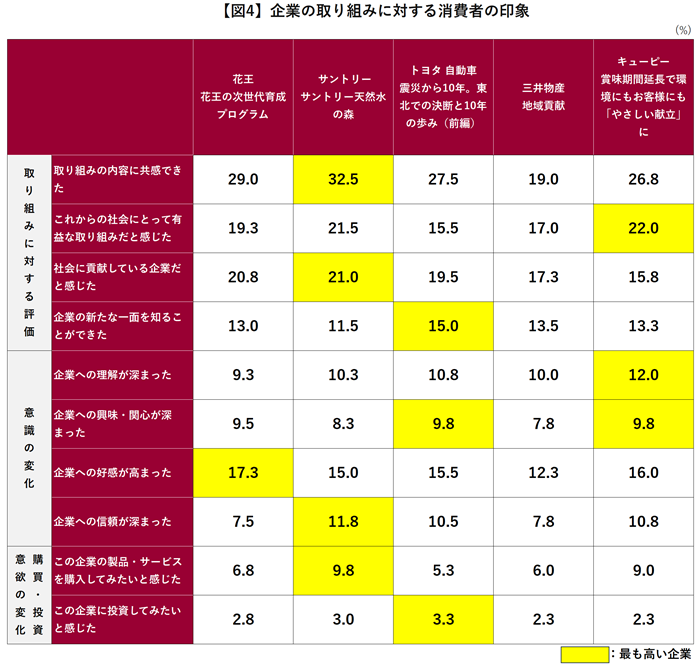 全体として「サントリー天然水の森」の評価が高く、「取り組みの内容に共感できた」「社会に貢献している企業だと感じた」など4つの項目で5社中最も高い評価となりました。その他、花王「次世代育成プログラム」は「企業への好感が高まった」が、トヨタ自動車「震災から10年。東北での決断と10年の歩み」は「企業の新たな一面を知ることができた」が、キユーピー「賞味期間延長で環境にもお客様にも「やさしい献立」に」は「これからの社会にとって有益な取り組みだと感じた」が5社中最も高い評価でした。