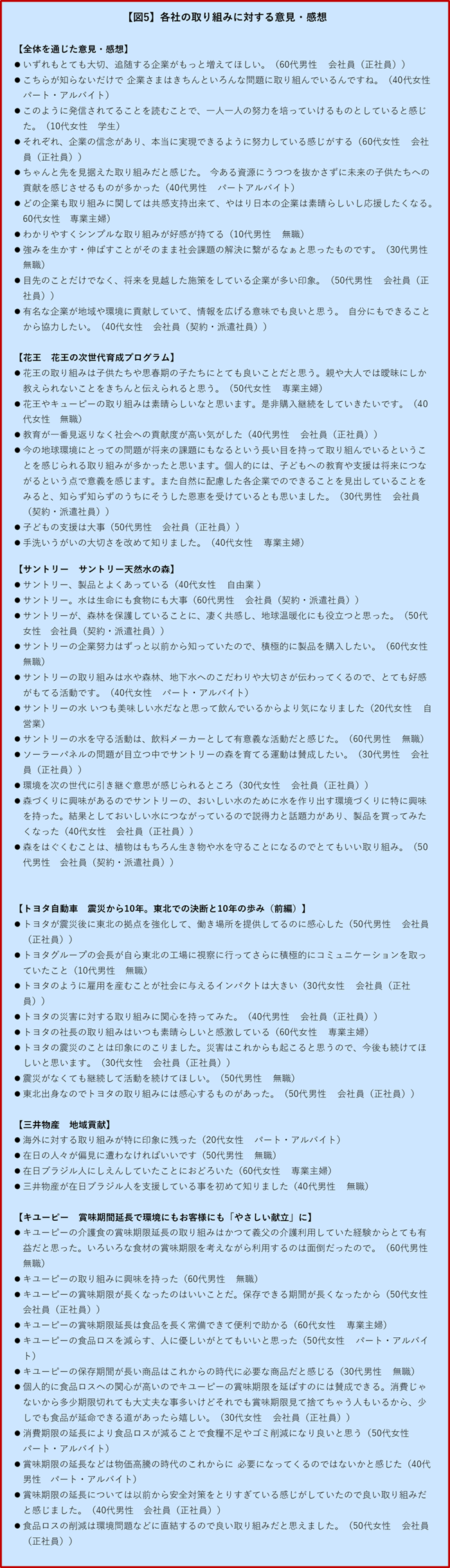 企業別に見ると、花王では「親や大人では曖昧にしか教えられないことをきちんと伝えられると思う」「教育が一番見返りなく社会への貢献度が高い気がした」といった教育支援の重要性に関する意見や「花王の製品を購入し続けたい」という購買継続の意向が見られます。 サントリー、キユーピーでは、食品を扱う企業ならではの取り組みに賛同する声のほか、「商品を買いたい」と思ったという意見が聞かれました。また、トヨタ自動車では企業トップが自ら動いてコミュニケーションを取っていたことに対して賛同の声が挙がっています。 三井物産では人道支援に関する取り組みについて、在日ブラジル人を支援していることを「初めて知った」「意外だった」という声が聞かれました。